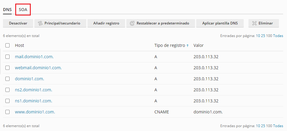 Nos mostrará la configuración DNS de nuestro servidor, debemos hacer clic en la opción "SOA" que se encuentra en la parte superior.