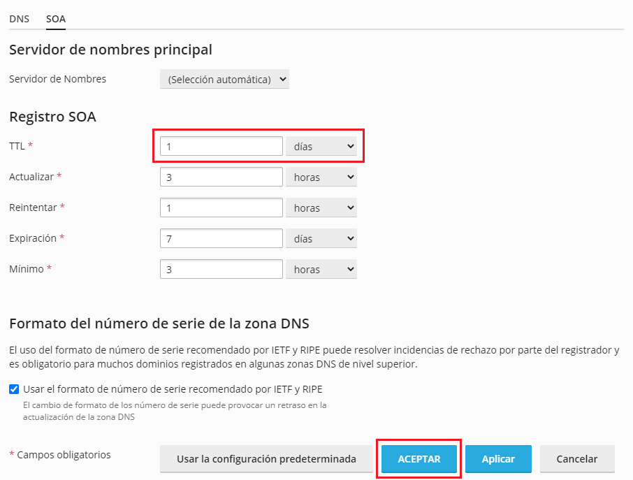 Nos aparecerán las opciones del registro SOA, desde aquí podremos modificar el valor TTL, por último, hacemos clic en "Aceptar".