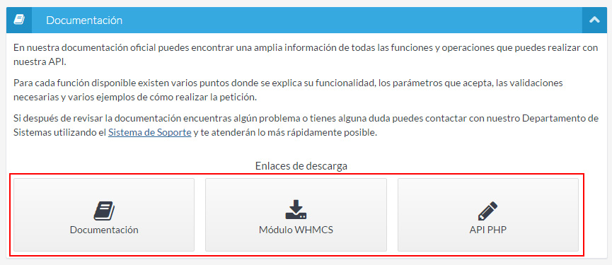 Si utilizas WHMCS y quieres automatizar acciones con tus dominios, e integrarlas en tu sistema, tan solo tienes que acceder al Sistema de Soporte dentro de la Extranet de Cliente y solicitar que te activen el acceso al API y al módulo WHMCS.