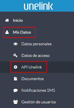 Una vez activado el acceso podrás descargar, tanto los archivos como todos los manuales, desde la opción "Mis Datos -> API Unelink".
