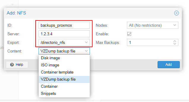 Si tienes un servidor dedicado con Proxmox es muy sencillo crear una partición NFS desde su panel.