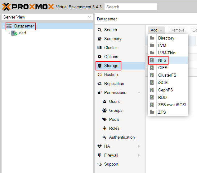 En la parte izquierda haz clic en Datacenter y en las diferentes opciones que aparecen haz clic en Storage y luego en el botón Add y NFS entre las opciones disponibles.