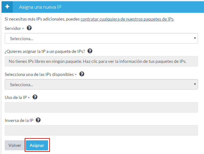 Haciendo clic en el enlace que te indica las IPs que tienes disponibles podéis seleccionar una IP de la lista de direcciones disponibles y asignarla a un paquete de IPs determinado, así como elegir el servidor donde va a ser configurada y el uso que se le va a dar. Tan solo tenéis que seleccionar los distintos datos en los desplegables.