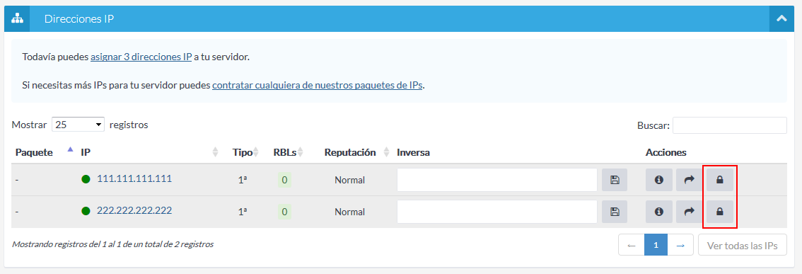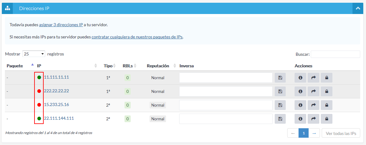 El estado de la IP (si está activada o no) podréis consultarlo desde el propio listado de IPs, mostrándose el botón en verde o en rojo dependiendo de su estado (verde = IP activa, rojo = IP desactivada).
