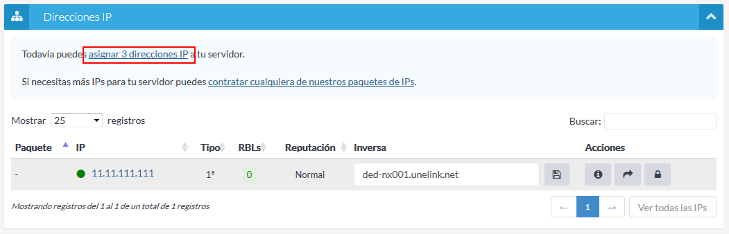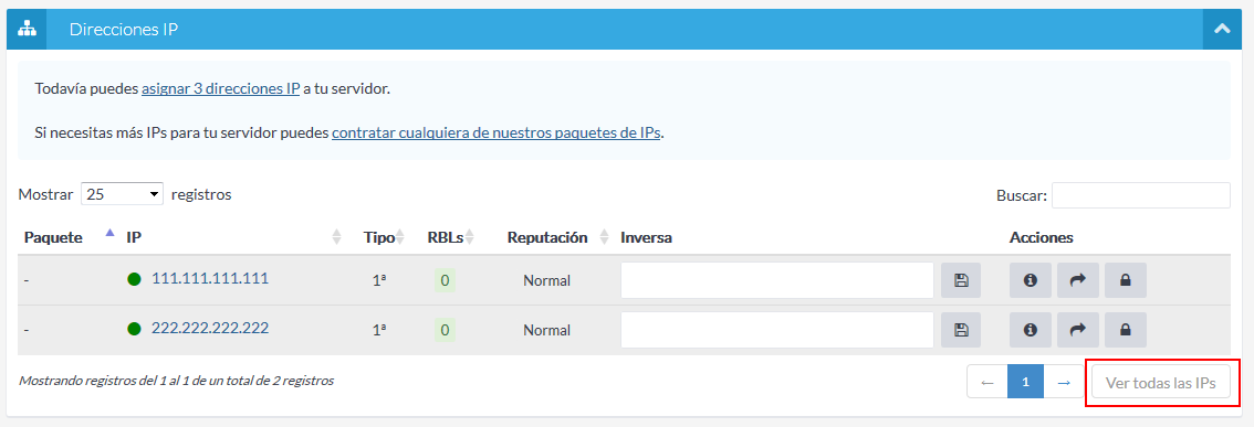 Al entrar en vuestra Extranet de Cliente, si tenéis algún servicio que incluya IPs, podéis acceder a la gestión de todas las IPs entrando a los detalles del producto con IPs y en el listado de sus direcciones hacer clic en el enlace "Ver todas las IPs".