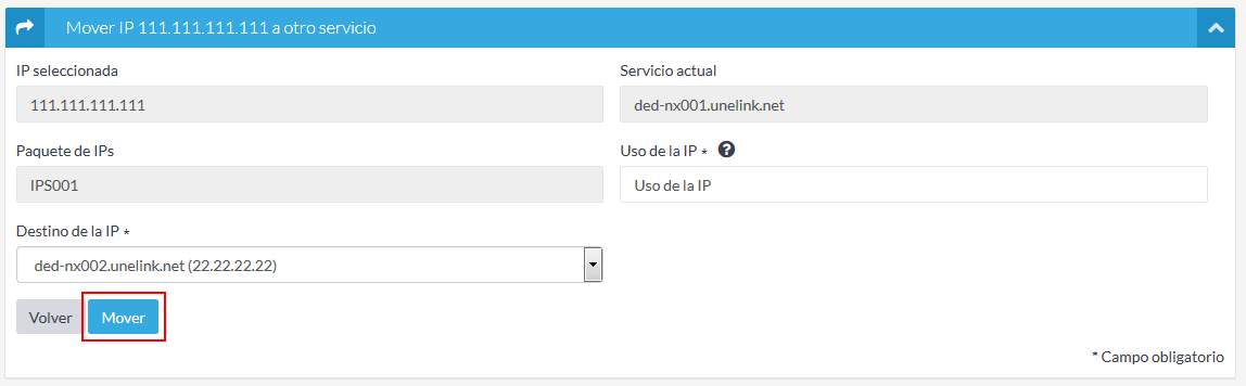 Para moverlas también es muy sencillo. Solo tenéis que hacer clic en el icono "mover", situado en la columna "Acciones", y seleccionar el nuevo destino de la IP. El asistente os irá guiando a medida que vayáis seleccionando los datos.