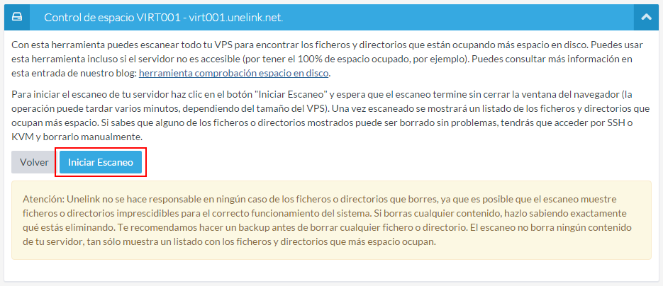 Estamos orgullosos de presentar una nueva herramienta para comprobar el espacio en disco de tu servidor virtual, desarrollada 100% por el Departamento de Desarrollo de Unelink.