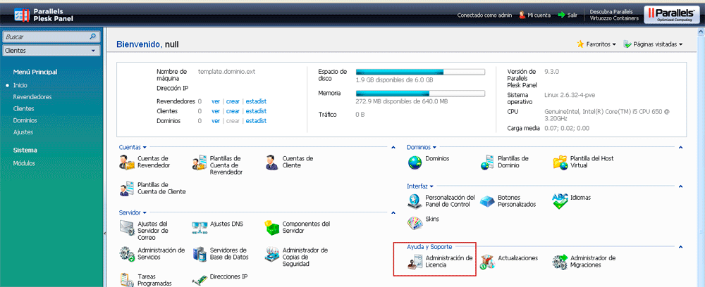 1. Paso 1: Acceder a su panel de control. Una vez dentro y en la pantalla de Inicio verá un icono en la parte inferior derecha de la página dentro de la sección Ayuda y soporte llamado "Administración de licencia". Pulsamos sobre este botón para acceder a la siguiente página.