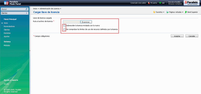 Paso 3: Para cargar la licencia deberemos encontrar el archivo en nuestro ordenador y marcar las dos casillas que aparecen justo debajo del campo para subir la licencia. Una vez seleccionado el archivo y marcadas las opciones pulsaremos el botón "Aceptar" y si no ocurre ningún error la licencia será cargada con éxito.
