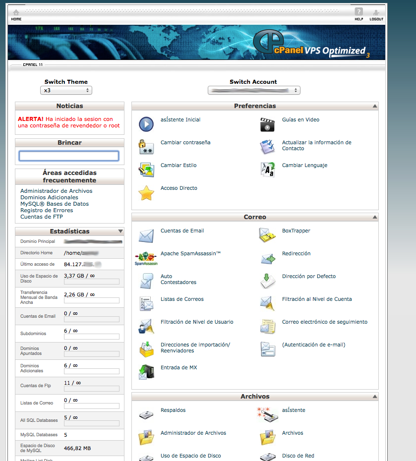En primer lugar indicar algo muy importante y es que cPanel se divide en dos paneles: cPanel y WHM. Con el primero podremos crear FTPs, DNS, gestionar webs, correos electrónicos y todo lo referente a un dominio. El otro panel es el WHM (panel de administrador) con el que podremos realizar todo tipo de acciones: crear o borrar dominios, asignar cuotas, añadir módulos de Apache, gestionar DNS generales, modificar valores de php.ini, etc.