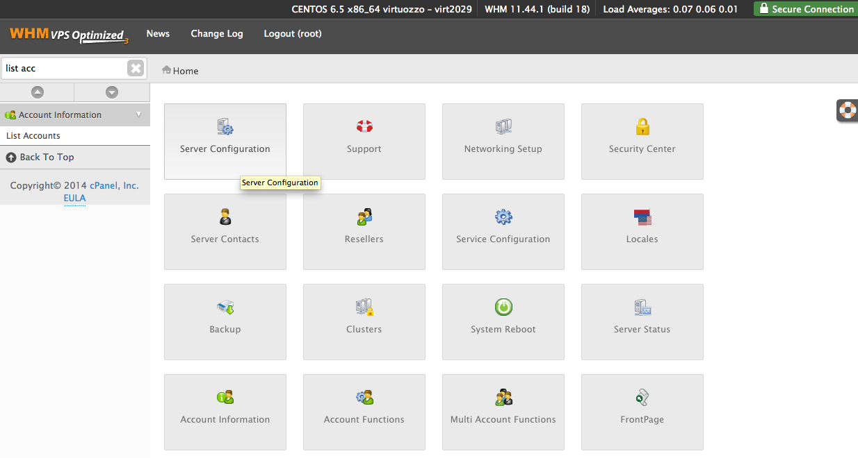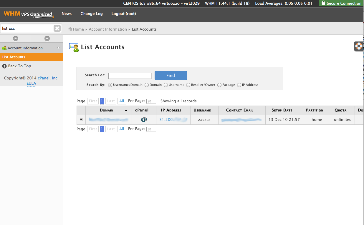Una vez creado podemos entrar de diferentes modos en el cPanel del nuevo dominio. Si no somos el administrador del servidor tendremos que entrar usando la URL: https://dirección_ip:2083. Si, por el contrario, somos el administrador del servidor, y estamos dentro del WHM, podemos entrar a través de él. Para ello debemos listar las cuentas creadas. De nuevo usaremos el buscador e indicaremos "List Accounts" en el campo de búsqueda.