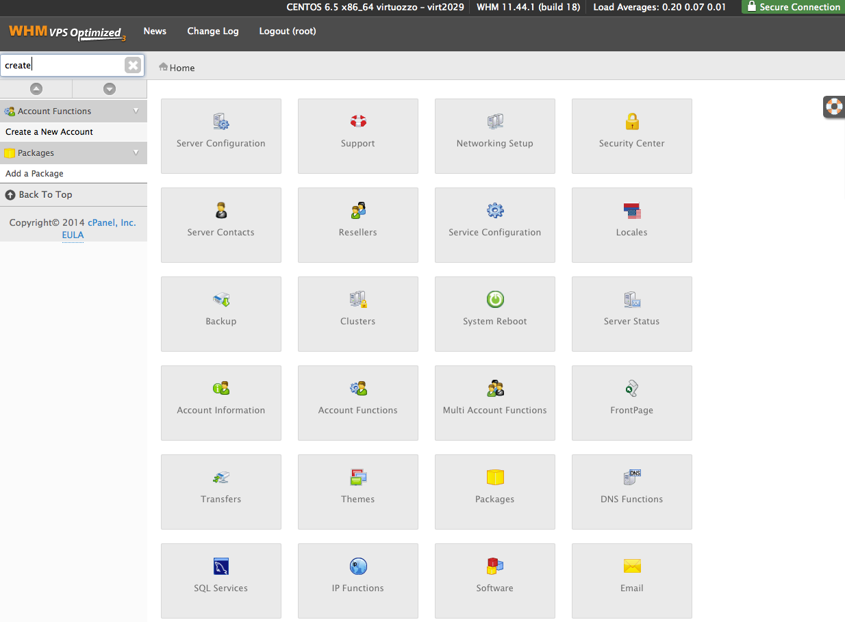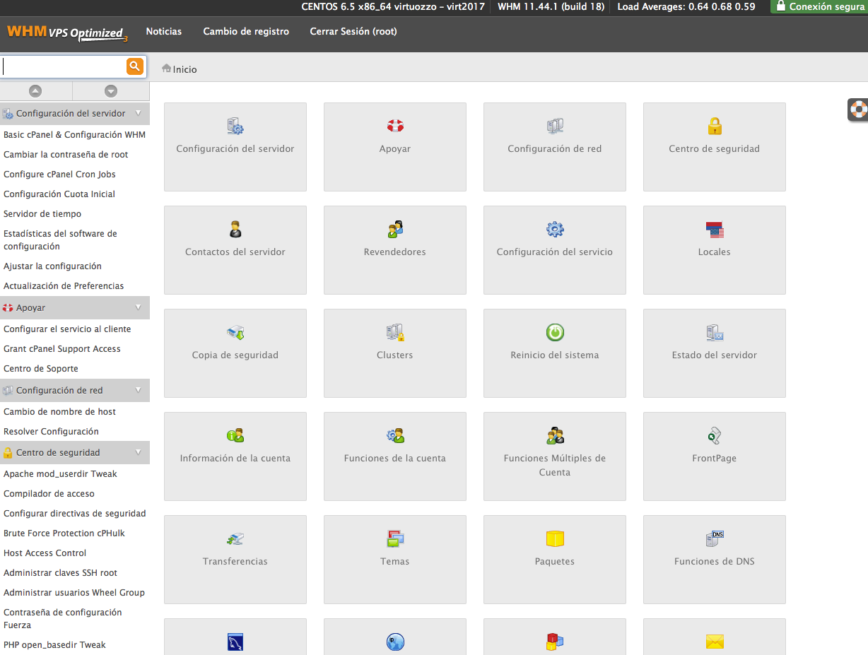También en la parte superior derecha de la pantalla del WHM podemos ver la versión del sistema operativo y el load average del servidor, que nos indica la carga que tiene. Sin entrar en detalles, si observamos un valor de load muy alto y constante (superior a 4.00) tendremos que hablar con nuestro administrador ya que el servidor puede estar sobrecargado.