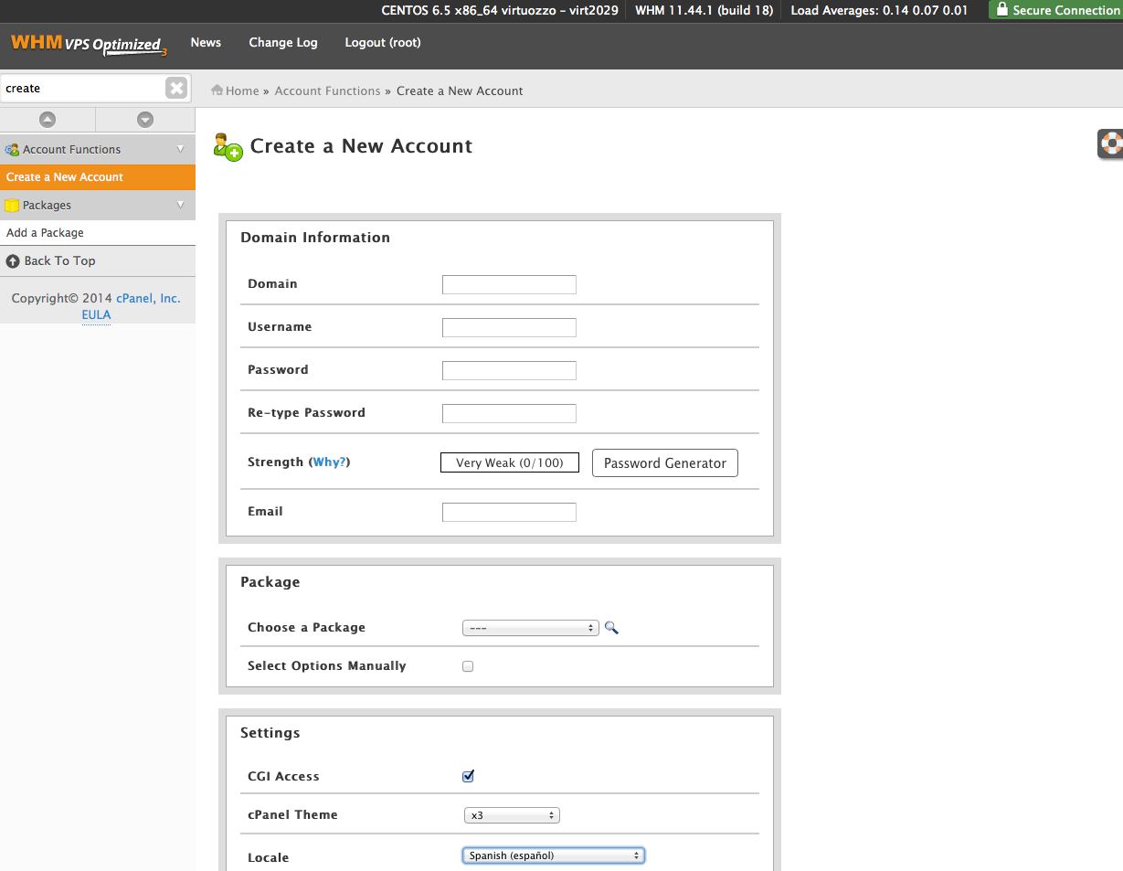 Seleccionamos la opción "Create a New Account" y nos aparecerá un formulario para rellenar datos referentes al dominio que queremos crear como el nombre, usuario o contraseña. Hay valores que debemos tener en cuenta, como el usuario y la contraseña, que nos servirán para acceder tanto al cPanel como al FTP del dominio.