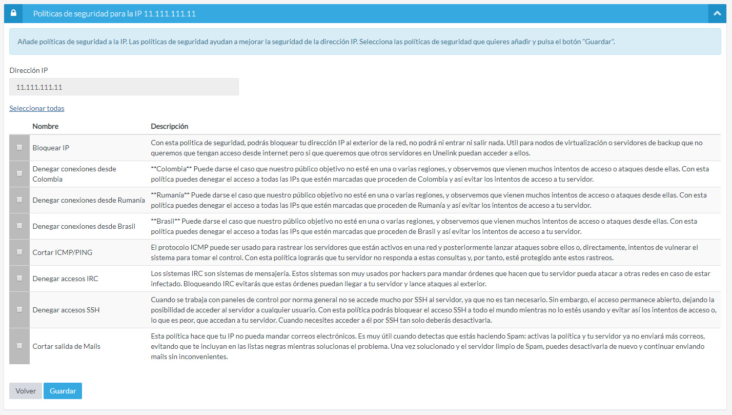 En esta opción podéis ver todas las medidas extra de seguridad que puedes aplicar a tus IPs. A continuación os vamos a recomendar unas medidas de seguridad que os pueden ser de gran ayuda.
