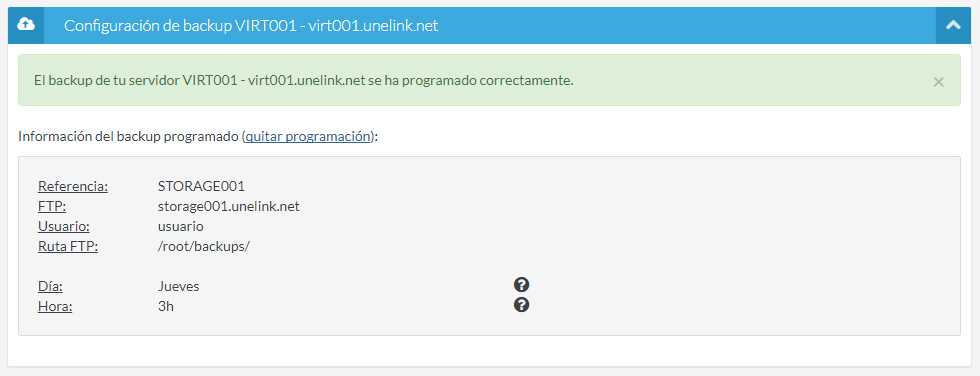 Si más adelante queréis cambiar los datos de la configuración, o quitarla por completo, tenéis que hacer clic en el enlace "quitar programación" que tenéis en la pantalla con la configuración del backup. Tened en cuenta que al quitar la programación no se borra ningún dato de vuestro servidor, si no que tan solo se elimina el lanzamiento de la copia.