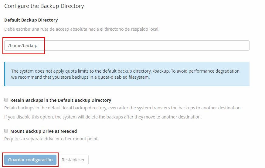 Puedes indicar la ruta donde quieres que se guarde el backup en tu servidor. Finalmente, pulsa el botón Guardar configuración.