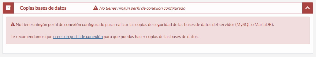 Puedes programar copias de las bases de datos de tu servidor desde tu Extranet de Cliente. En este apartado se muestran las copias que tengas programadas o avisos en caso de que no hayas programado ninguna.