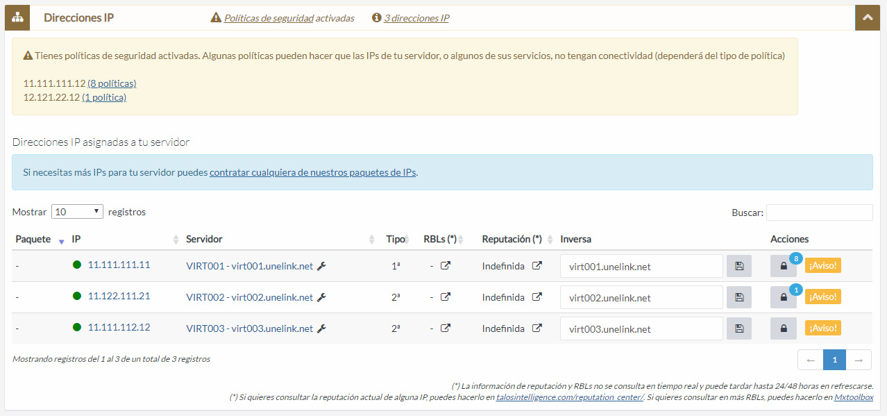 Te muestra un resumen de las direcciones IP del servidor: las que tienes libres u ocupadas, la reputación, inversas, políticas de seguridad, etc.