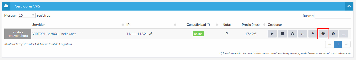 Primero vamos a ver qué contiene el Sistema de Salud de los servidores VPS. Para ello, haz clic en la opción de menú "Servidores VPS" dentro de la sección "Gestión de productos". En la tabla, pulsa el botón con icono de corazón del servidor para el cual quieres ver su estado de salud.