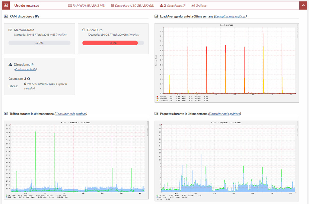 En este apartado puedes consultar el uso de todos tus recursos, ya sea el disco duro o RAM ocupada, como las IPs o las gráficas de load y tráfico.