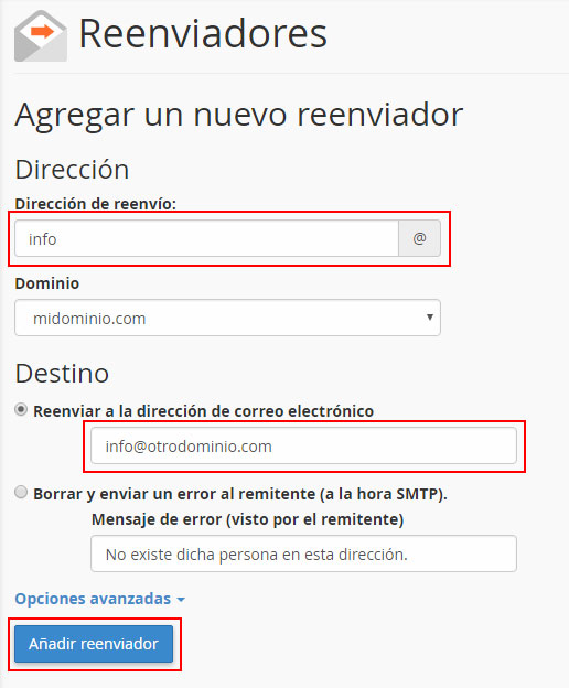 Ten en cuenta que el email de origen no hace falta que esté creado en el dominio. En caso de no existir, todo lo que se envíe a dicha cuenta será reenviado y no existirá copia de los emails recibidos en la cuenta de origen.