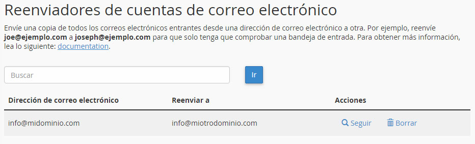 En la pantalla de "Reenviadores" puedes ver todos los reenviadores creados.