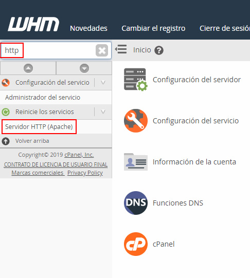 Dentro del WHM, utiliza el buscador principal, busca http y haz clic en Servidor HTTP (Apache).