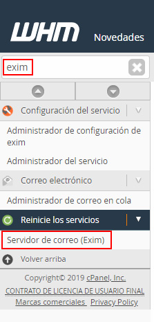 Dentro del WHM, utiliza el buscador principal, busca exim y haz clic en Servidor de correo (exim).