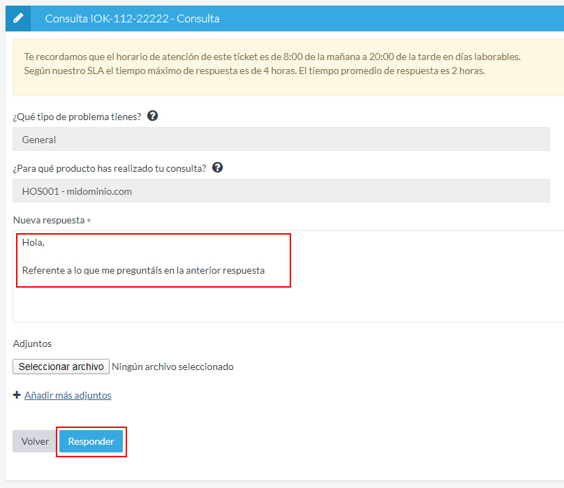 Si necesitas responder a una consulta puedes hacerlo desde el Sistema de Soporte de tu Extranet de Cliente. Por defecto el Sistema de Soporte cierra las consultas después de contestarlas, pero puedes responder igualmente y al hacerlo se volverán a abrir.