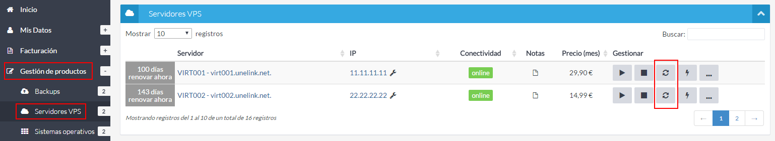 También en nuestros servidores virtuales puedes reiniciar tu servidor en unos instantes pulsando sólo un botón. Para ello accede al listado de servidores VPS desde el enlace del menú de la izquierda, dentro del apartado "Gestión de productos", y pulsa el botón para reiniciar el servidor situado en la columna "Gestionar".