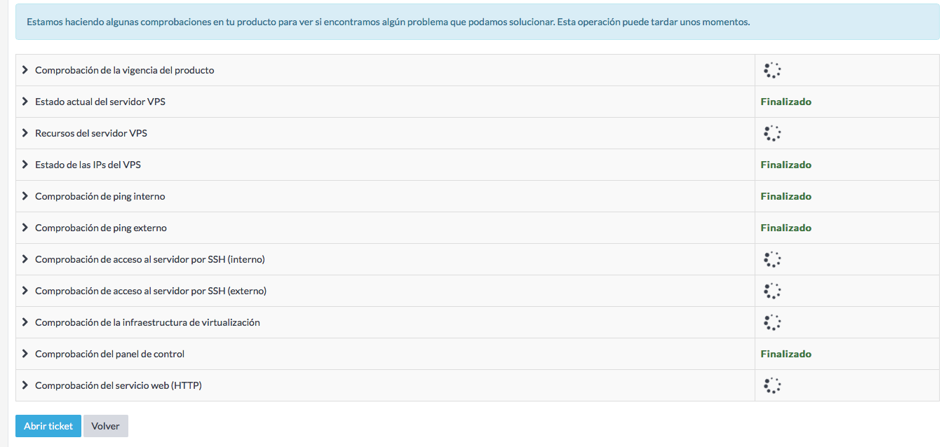Con el tiempo hemos ido recopilando información de los problemas más comunes que tienen nuestros clientes. La mayoría tienen soluciones muy concretas y, en muchas ocasiones, sencillas de aplicar. Tras estudiarlos minuciosamente hemos generado un sistema asociado a nuestro sistema de tickets que actúa cuando vas a enviar tu consulta, realizando multitud de comprobaciones en tu servicio.