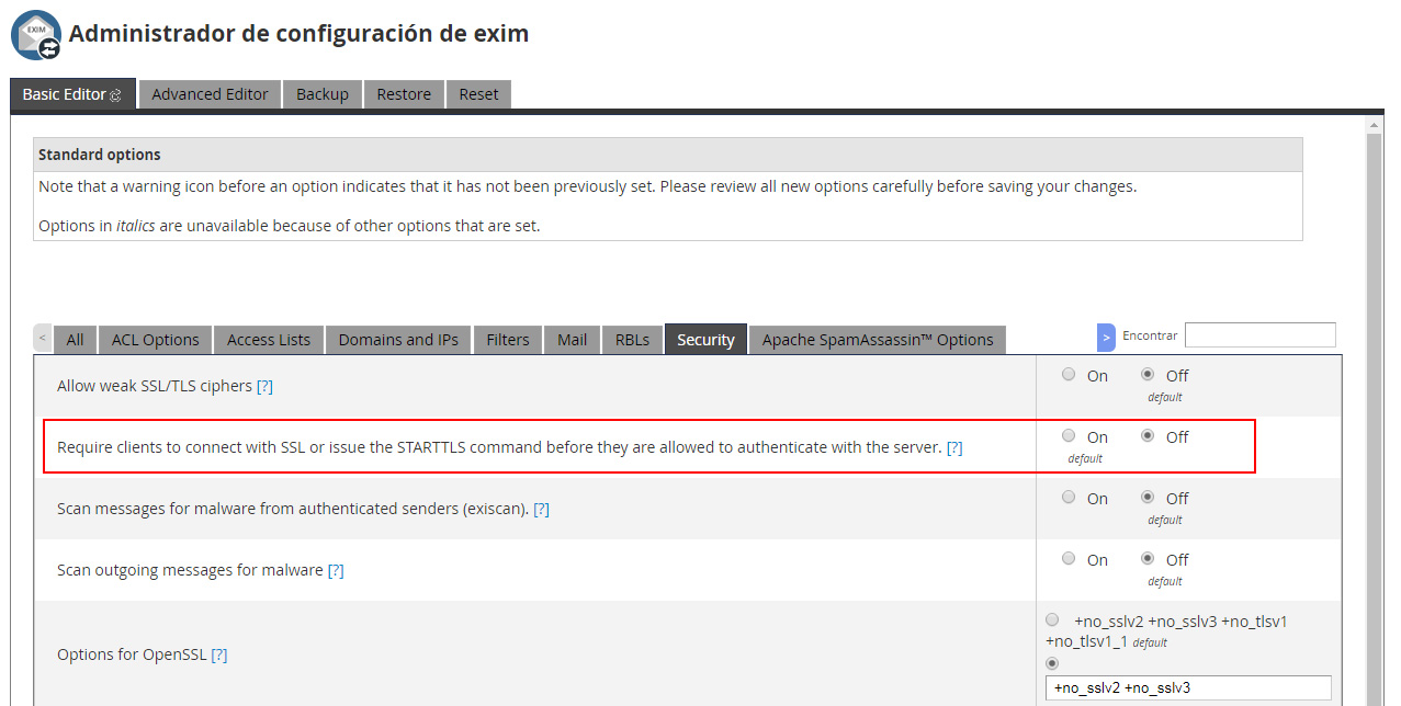 Dentro de la administración de exim, pulsa en la pestaña Security.