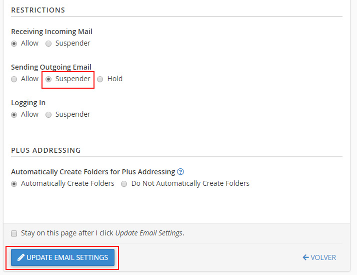 Selecciona la opción Suspender dentro de la sección Sending Outgoing Email y pulsa el botón Update Email Settings para aplicar los cambios.