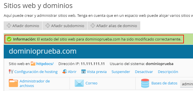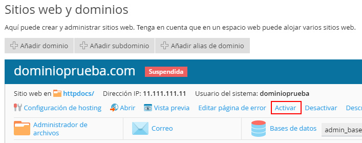 Si quieres volver a activar un dominio suspendido tan solo tienes que hacer clic en el botón Activar.