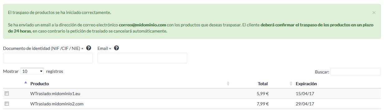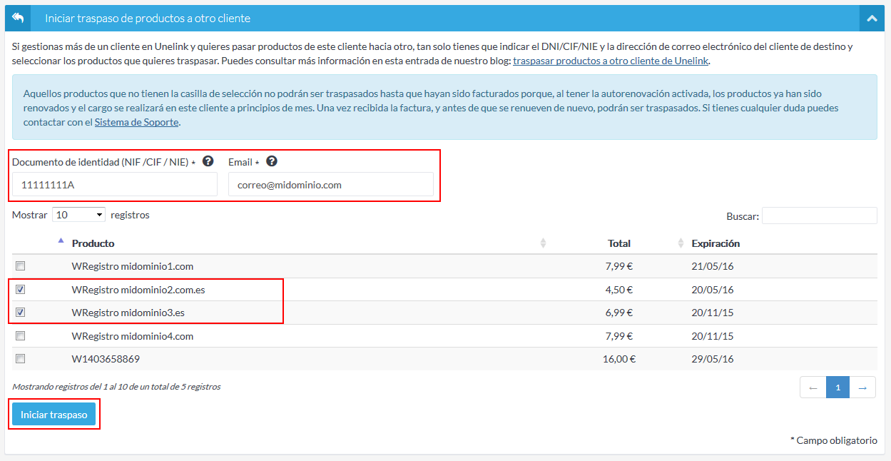 En esta pantalla, en la sección "Iniciar traspaso de productos a otro cliente", tenéis que indicar el documento de identidad (DNI, NIF o NIE) del cliente al que queréis traspasar los productos ("Destino"). Además, también tendréis que indicar el correo electrónico con el que se dio de alta en Unelink. En el listado inferior, seleccionad los productos a traspasar marcando las casillas de la izquierda. Por último, tendréis que hacer clic en el botón "Iniciar traspaso" para que se inicie el proceso.