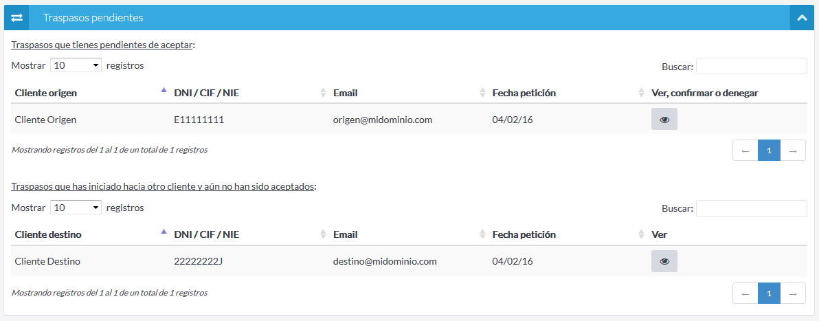 En esta misma sección, tanto el cliente "Origen" como el "Destino", pueden consultar las órdenes de traspaso que tienen pendientes de aceptar o que han solicitado para otros clientes. En el listado de solicitudes, haciendo clic en el enlace "Ver", podéis consultar los detalles de las solicitudes y confirmar aquellas que son hacia vosotros.
