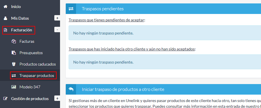 Lo primero que tenéis que hacer es acceder a la sección "Facturación -> Traspasar productos" de la Extranet del cliente "Origen".