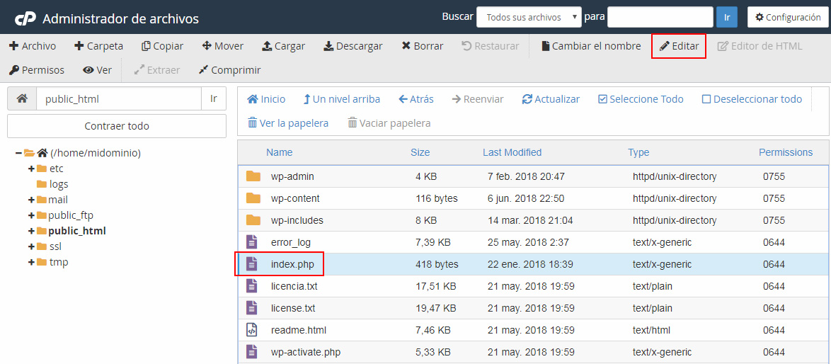 Si necesitas realizar una pequeña modificación en un archivo, en vez de descargarlo, editarlo y subirlo de nuevo, puedes utilizar la herramienta de administración de archivos de cPanel. Como incluye un editor de texto, puedes realizar este cambio rápidamente desde el propio panel.
