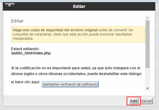 Te aparecerá un aviso de advertencia antes de mostrar el contenido del fichero. Pulsa el botón "Edit" para ir a la edición del archivo.